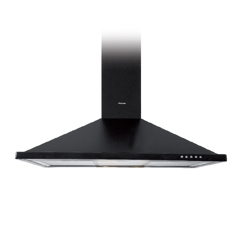 Hotte Cheminée 90 CMModèle Pyramidale Noir3 vitessesBoutonsDébit : 850 m3/hEclairage : 2 lampes x 40WFiltre aluminium lavableFiltre anti-odeur en charbon OptionelClasse énergétique ADiamètre évacuation : 125 mm