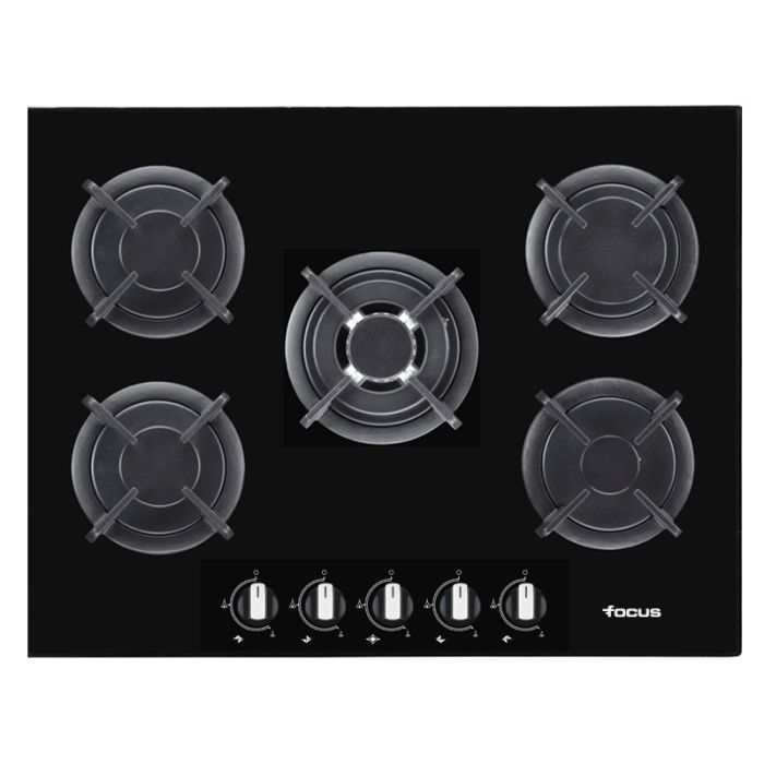 Plaque de Cuisson Encastrable - Type de Plaque: à Gaz - Largeur: 70 cm - Nombre de Foyers: 5 Foyers à gaz dont un brûleur à triple couronne - Revêtement: Vitrocrystal - AVEC sécurité thermocouple - Flamme stabilisée - Grilles et chapeaux de brûleurs en fonte - Allumage Automatique - Commandes frontales - Couleur: Noir - Garantie: 1 an