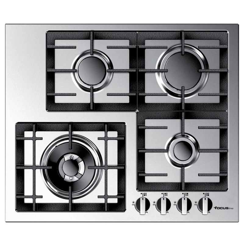 QUADRA 62Inox 62 CM4 Brûleurs à gaz, l’un double CouronnesFlamme stabiliséeGrilles et chapeaux de brûleurs en fonteAllumage AutomatiqueCommandes frontalesSécurité gaz sur chaque brûleur