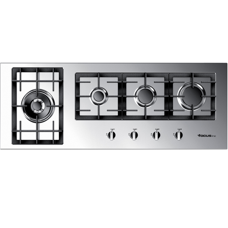 Inox 112 CM4 Bruleurs à gaz, l’un Triple CouronnesFlamme stabiliséeGrilles et chapeaux de brûleurs en fonteAllumage AutomatiqueCommandes frontalesSécurité gaz sur chaque brûleur