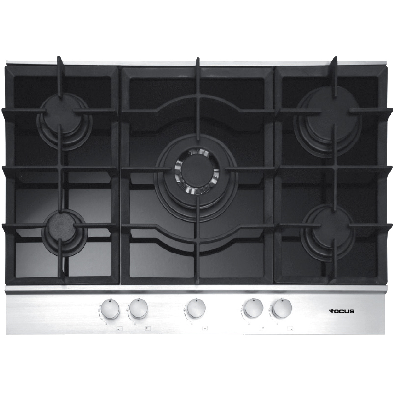 Vitro noir 75 CMCadre Aluminium5 Bruleurs à gaz, l’un Triple CouronnesFlamme stabiliséeGrilles et chapeaux de brûleurs en fonteAllumage AutomatiqueCommandes frontalesSécurité gaz sur chaque brûleur