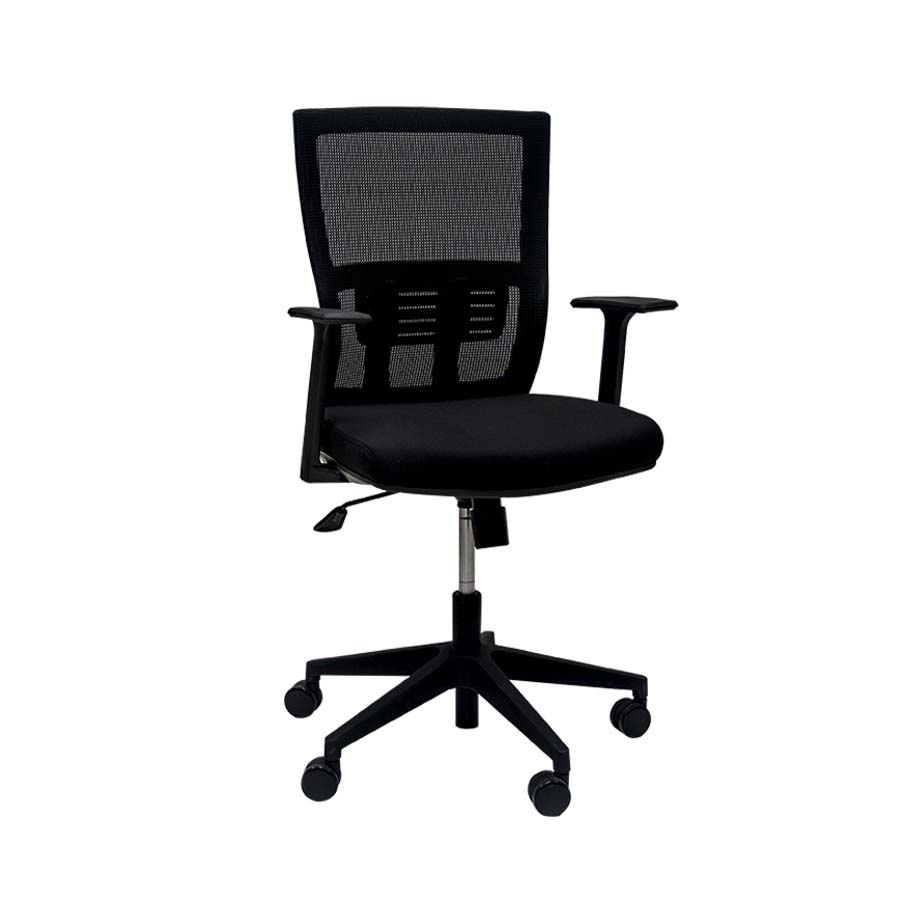 Dossier micro-perforé en résille, accoudoires fixes, pieds roulants, tension et hauteur réglables