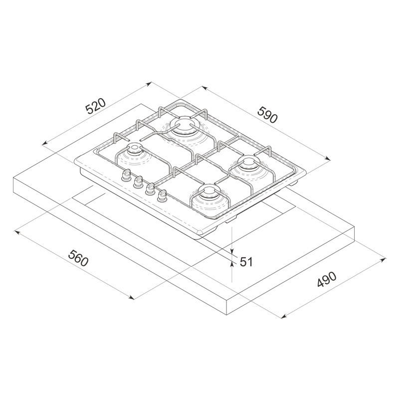 F 408XInox 60 Cm4 Brûleurs à gazFlamme stabiliséeGrilles et chapeaux de brûleurs en fonteAllumage AutomatiqueCommandes frontales